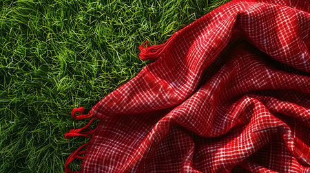 Red plaid on green grass background. Picnic concept