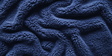 A soft fleece fabric texture background in a deep navy blue. The warm, brushed surface with visible fiber density provides a cozy, insulating feel, evoking winter clothing and comfortable, snug textiles.