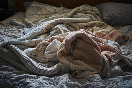 Closeup of a disheveled bed with tangled blankets in soft morning light