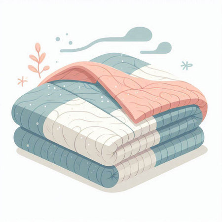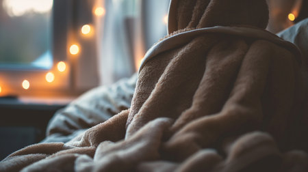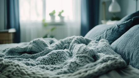 A cozy and inviting blanket lays gently on a plush bed, emphasizing warmth and comfort. The soft textures and natural light create a serene atmosphere perfect for relaxation.