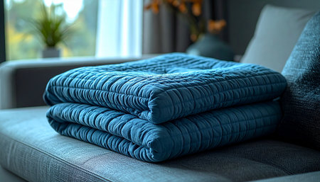 A soft, blue quilted blanket is neatly folded on a comfortable sofa, bathed in gentle natural light from a nearby window. This tranquil scene evokes a sense of warmth, relaxation, and the simple, cozy comforts of home, perfect for a quiet afternoon rest.