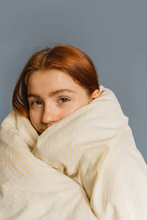 Woman wrapped in blanket isolated over studio background