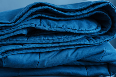 Close-up view of soft, textured blue linen fabric draped over a cozy bed. The serene colors and natural fibers create an inviting atmosphere perfect for relaxation.