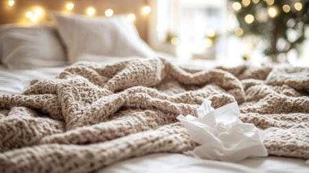 Used tissues scattered around a cozy blanket, suggesting rest and recovery in a warm, softly lit bedroom