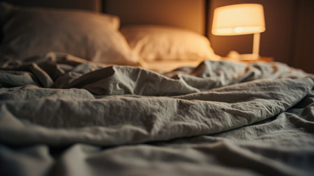 Close-up of rumpled gray bed linens with pillows and a lit lamp, creating a warm and inviting atmosphere.
