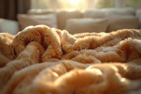 A plush golden blanket rests comfortably on the sofa in a sunny living room, creating a warm and inviting atmosphere during a tranquil afternoon.