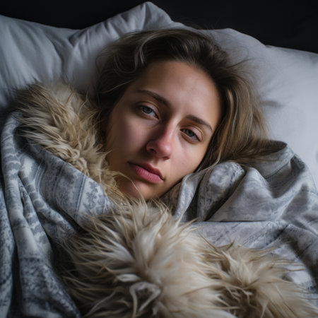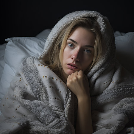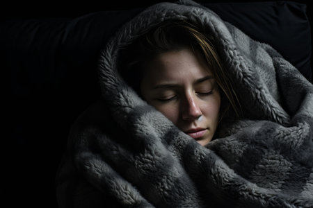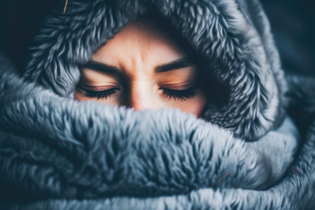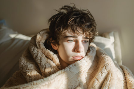 A young person is wrapped in a blanket with a contemplative expression in the soft morning light, suggesting introspection and solitude.
