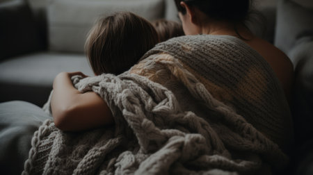 Mother and daughter wrapped in warm blanket sitting on sofa at home.