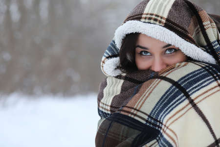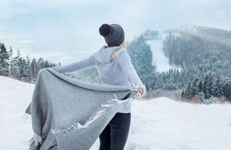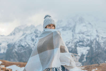 Teen girl wrapped in plaid blanket standing on mountain. Cold weather, snow on hills. Winter hiking scene.