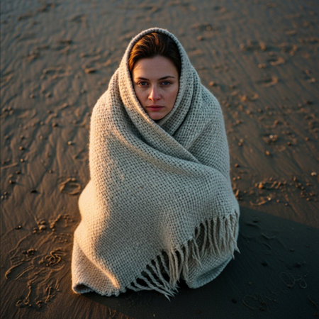 High-angle cinematic view of a person wrapped in wool watching the harsh sunrise on a cold beach.