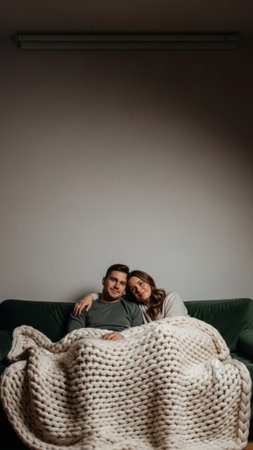 A photorealistic, vertical full body shot capturing a couple settled deeply into a sofa during a coz