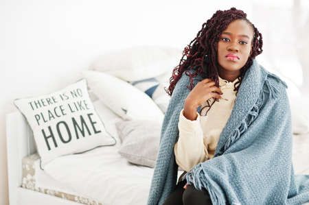 Young woman covered with warm blanket sitting on sofa in living room at home