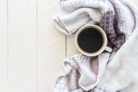 Top view photo of cup of tea with lemon slice and gray sweater on isolated white background with copyspace