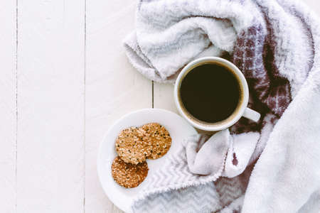 Cozy breakfast: cup of hot tea, apple, cookies and a blue checkered woolen plaid. Cozy winter home arrangement.