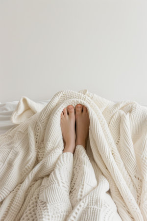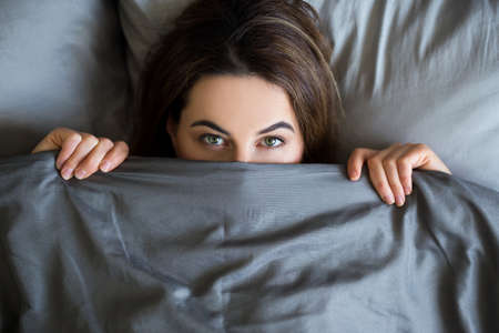Woman hiding from the problems under the gray blanket. Photo of bed with gray blanket and two female hands, free space for text. Fear, introvert, loneliness background