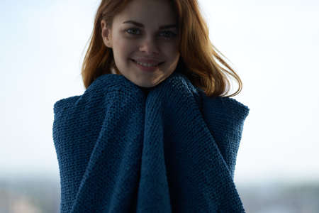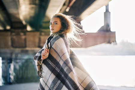 Portrait of pretty confident woman wrapped in wool blanket looking to camera posing on urban street background with copy space