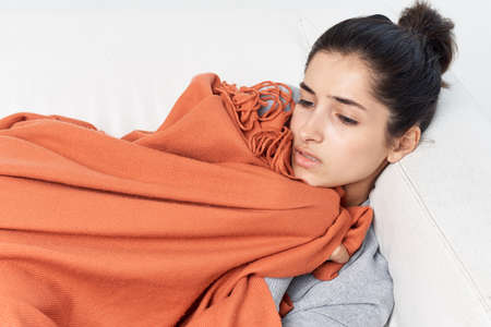 woman lies at home on the couch covered with a blanket with closed eyes cold