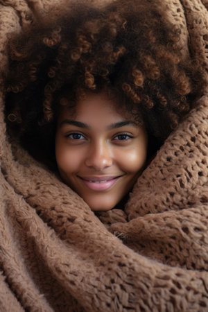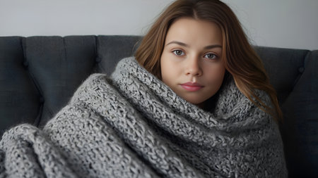 A woman wrapped in a fuzzy blanket on the couch, AI