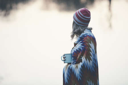 Vintage color portrait of young blonde woman in red cap and knitted colourful blanket enjoying sunset silence near lake with mug of tea - peace, calm and serenity concept, copy space