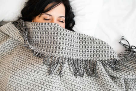Sleeping Brunette Blanket Nap Relax Dreaming Bedroom Women Concept