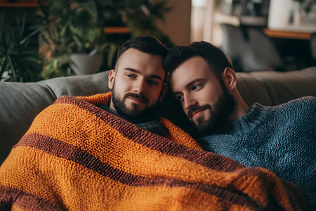 selective focus of handsome bearded gay couple wrapped in blanket at home