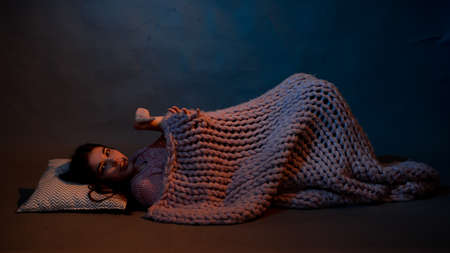 Caucasian woman lies covered with gray knitted blanket on living room sofa. Tired. Rest. Cold.