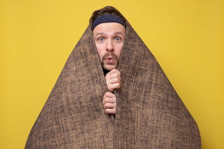 Photo of young funky funny crazy amazed man covered in blanket hear shocking news isolated on pink color background