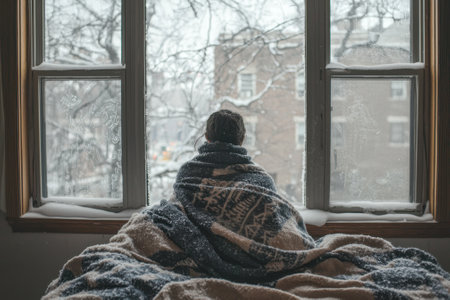 A person is wrapped in a blanket and sitting in front of a window. The window is frosted, and the person is looking out at the snow. Concept of coziness and warmth