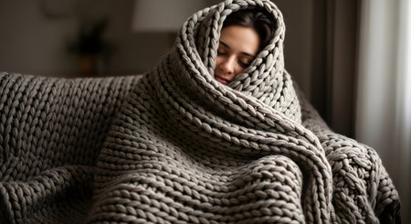 A relaxed woman sleeping comfortably on a sofa wrapped in a thick grey chunky knit blanket. The image evokes feelings of warmth, comfort, and hygge during the colder months.