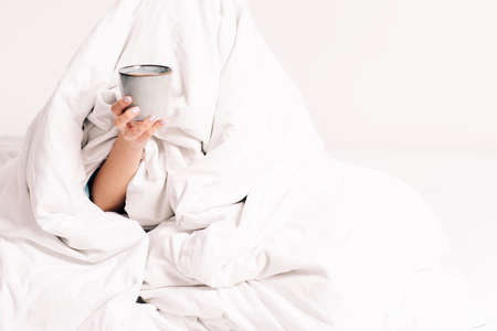 A young girl is too lazy to get out of bed, sleep, early morning.Heavy morning awakening after hangover.Heavy morning.Woman suffering lack of sleep.Waking up from sleep with a cup of coffee.