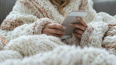 Woman relaxing on the couch, covered with a warm blanket, browsing on social media on her smartphone