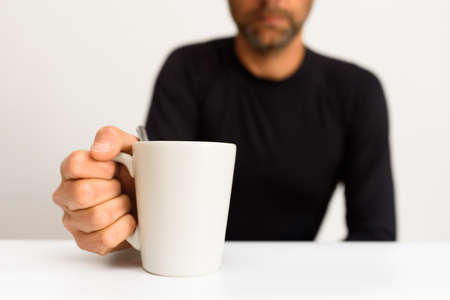 Out of focus man in the background grabs a blank cup on a white table.