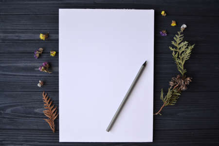 White paper and pencil with decoration on the wooden desk, top view.