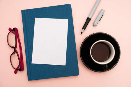 A blank sheet of paper beside cup of coffee on dark table