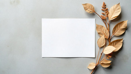 Elegant minimalist stationery mockup with dried leaves and gray background