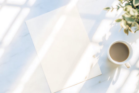 A serene workspace scene featuring an empty sheet of paper, a cozy coffee cup, and soft sunlight casting gentle shadows across a marble table, perfect for inspiration.