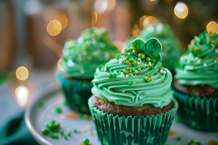 Delicious cupcakes with vibrant green frosting, shamrock decorations, and colorful sprinkles, displayed on a plate against a warm, bokeh-lit background, ready for a festive celebration.