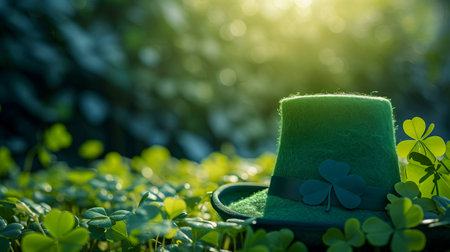 A stylish green hat rests on a bed of shamrocks, creating a festive St. Patrick's Day scene.