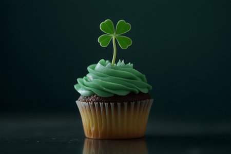 Delicious cupcake with green frosting and four leaf clover decoration, celebrating Saint Patrick's Day