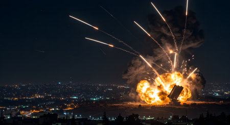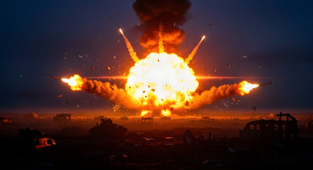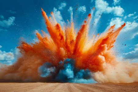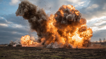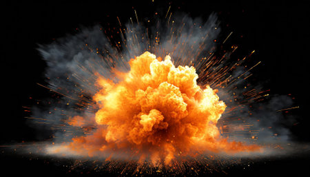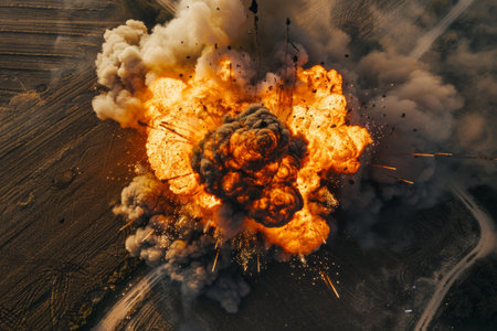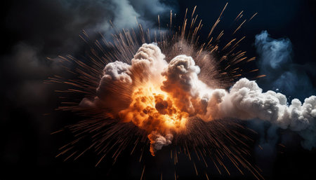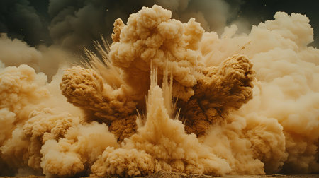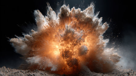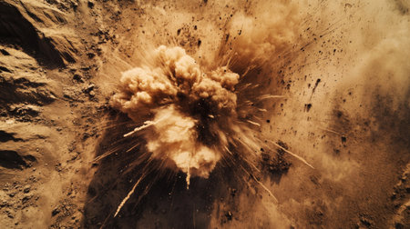 An intense explosion erupts generating a large cloud of dust and debris against a dark background illustrating the force of the blast and its impact on the environment.