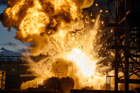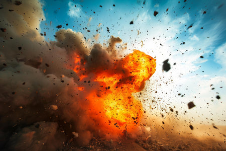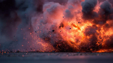 A large explosion bursts forth, showcasing vibrant flames and thick smoke, with debris flying through the air, creating an intense and chaotic atmosphere
