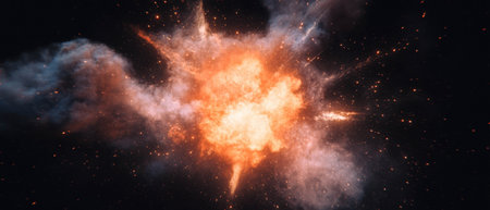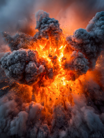 A stunning depiction of a powerful explosion, showcasing a fiery core surrounded by thick smoke and debris, creating an intense and dynamic visual with captivating energy.