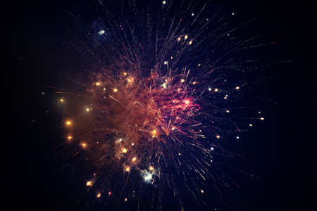 Beautiful colorful holiday fireworks on the black sky background, long exposure