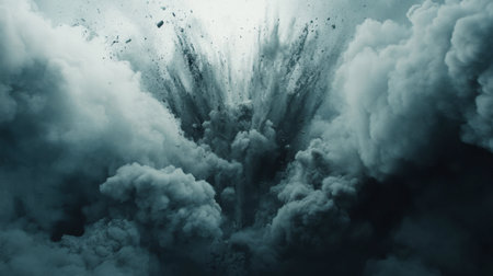 A dramatic scene depicting a powerful explosion with dark smoke and dust clouds. The image captures the intense energy and chaos of the moment, creating a captivating visual atmosphere.