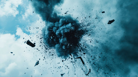 A dramatic explosion fills the sky with dark smoke and debris, creating an intense visual effect that captures the power and chaos of destruction.