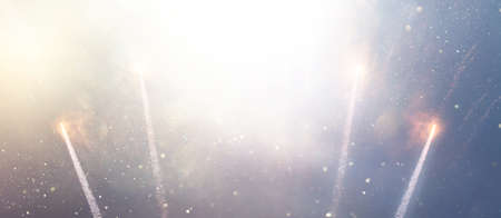 background of abstract gold, silver and blue glitter lights with fireworks. defocused