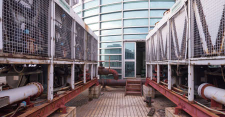 Chiller tower or cooling tower on rooftop of a office building. System work. Architecture machine. Condenser Water Supply (CDS) and Condenser Water Return (CDR) pipe lines. Ventilation compressor.
