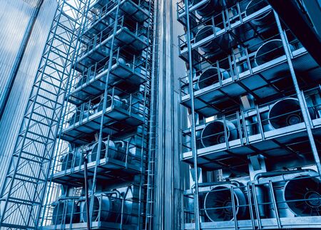 Inside of Industry factory. Chiller tower or cooling tower in building. System work machine. Condenser Water Supply and return pipe lines. Ventilation compressor. Water system in workshop.
