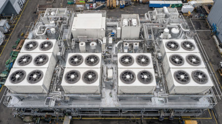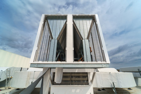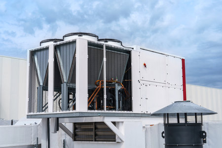 An heating ventilation and air conditioning device with fans on roof top, cool blue tone