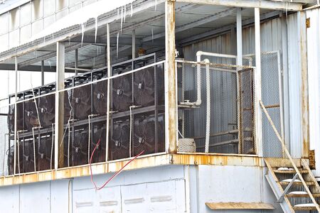 Industrial fans for air conditioning. Dirty air conditioner works behind a metal grate.